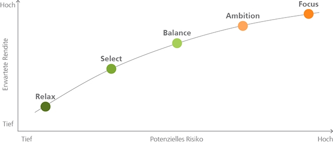 • Anlagestrategie "Relax/Select" für regelmässige Einkünfte mit geringen Schwankungen.